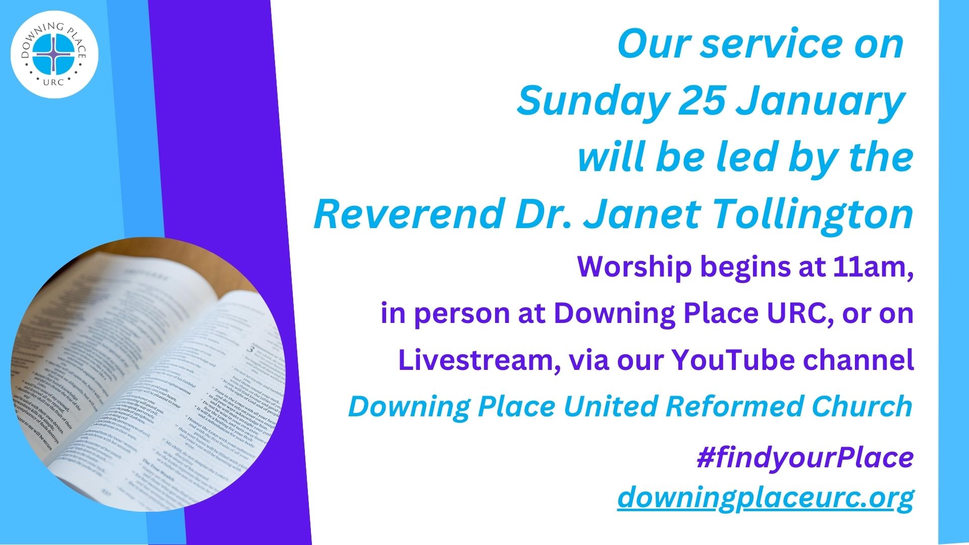 Everyone is welcome to gather in worship, whether you are a regular church goer or have never attended a service of worship before; or anything in between! If you are new to church or Downing Place URC specifically, we have a First Time in Church page to browse which will hopefully explain a few things and help you feel more at home.