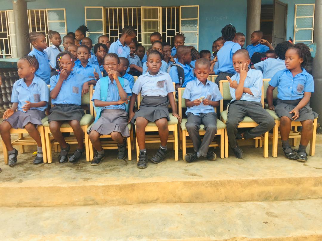 Children seated on chairs donated by the Church, send greetings and thanks to our members.