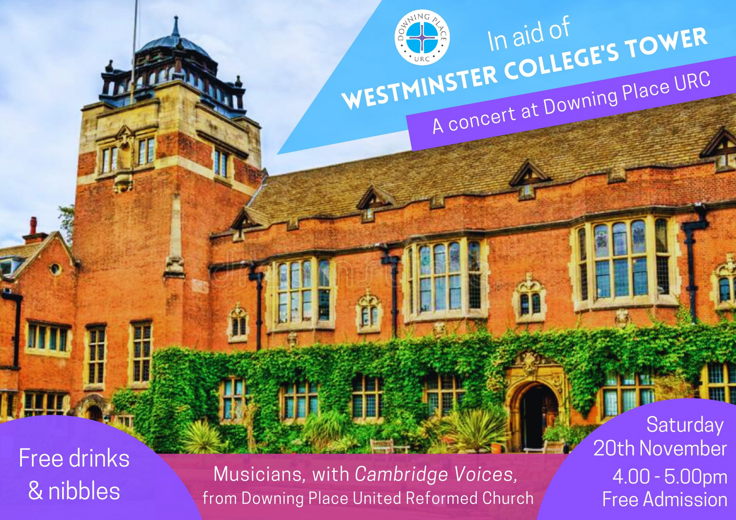 We have a marvellous concert at Downing Place tomorrow (Saturday 20 November)at 4pm to raise funds for Westminster College. Come and hear Revd Nigel Uden (Piano, & Digital Keyboard), Mark Dawes (Keyboards, Organ, Glockenspiel, Voice, Guitar, and Front Desk call-bell no. 1), Ian de Massini (Keyboards, Accordion, Tube Melodica, and Front Desk call-bell no. 2), Pippa Jones (Cello), Jane Bower (Voice, Guitar, and Narrator), Peter Sarkies (Oboe), and Cambridge Voices (choral music). Yes, you heard us – Front Desk Call Bell! Followed by drinks and nibbles. Free entry, retiring collection for urgent repairs to Westminster College’s tower.